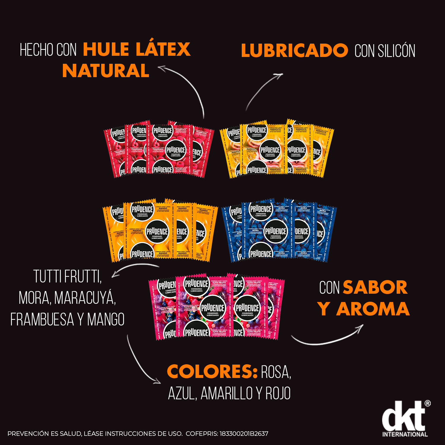 "Disfruta de un preservativo suave y lubricado que te transportará a un exótico paraíso de placer con sus cinco sabores: mango, mora, maracuyá, frambuesa y tutti frutti.