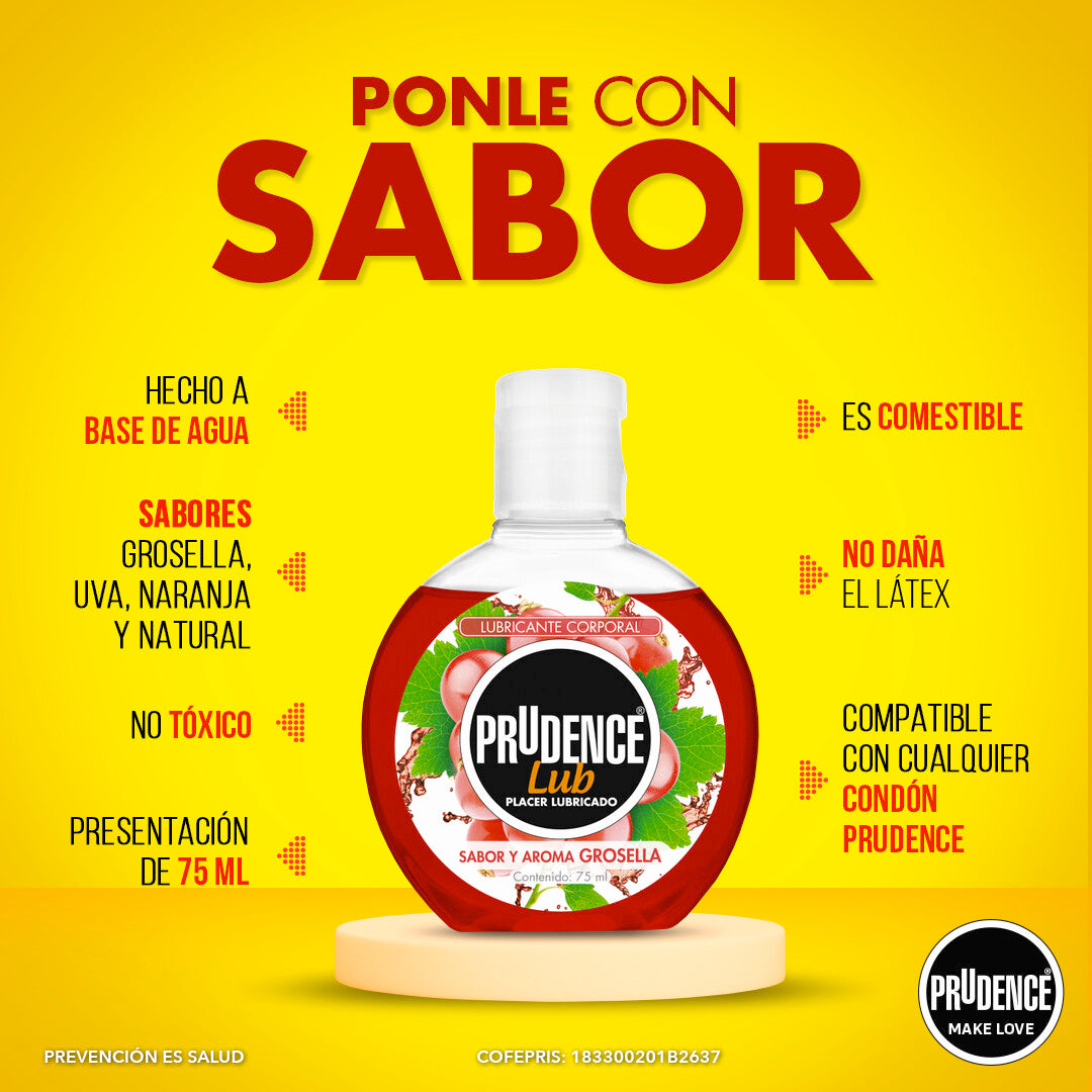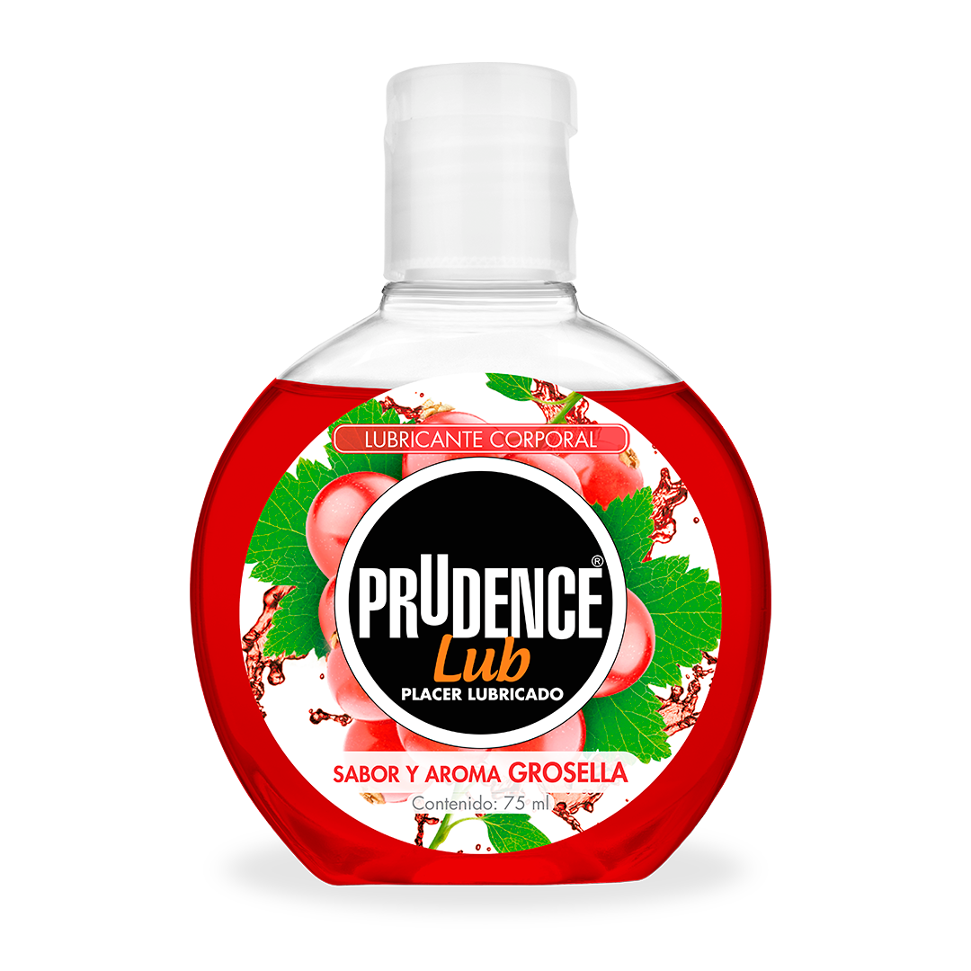 Prudence Lub Grosella: lubricante sabor y aroma grosella de 75 ml, comestible, textura ligera, base agua, libre de aceites, no tóxico, no daña el látex.