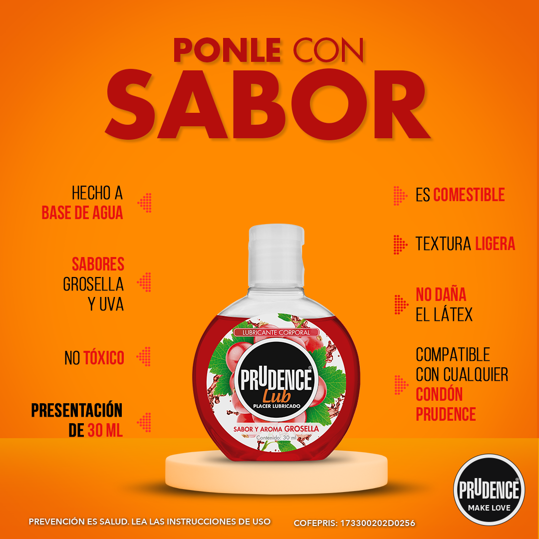 Lubricante comestible, textura ligera a base de agua, libre de aceites, no tóxico, no daña el látex, compatible con todo tipo de condón. Delicioso sabor y aroma a grosella.