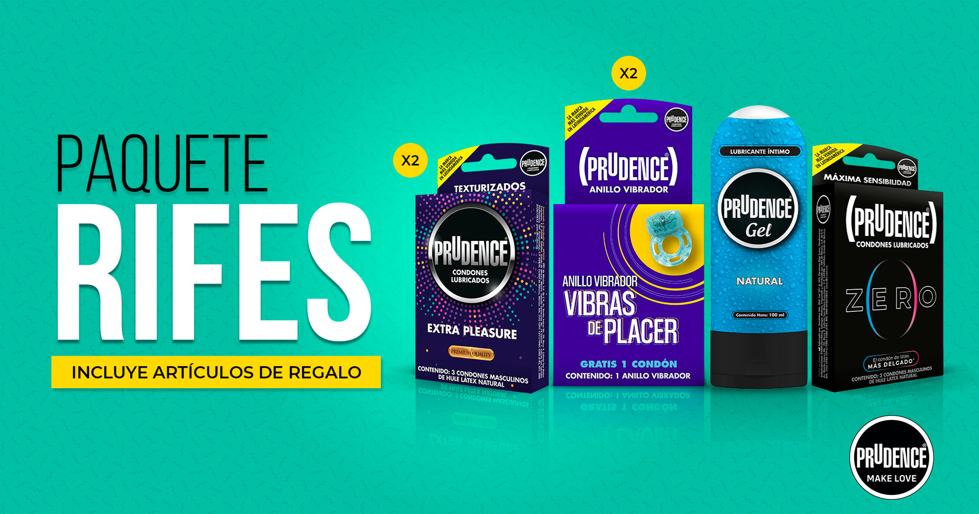 Incluye 2 Prudence Anillos Vibradores, 2 Prudence Extra Pleasure C/3, 1 Prudence Zero C/10 y 1 Prudence Gel Natural.